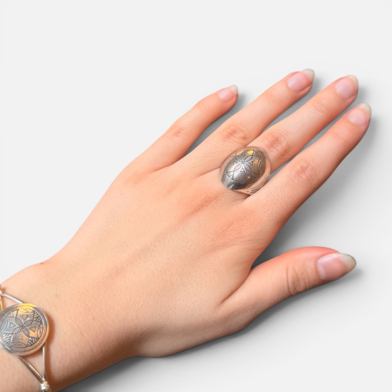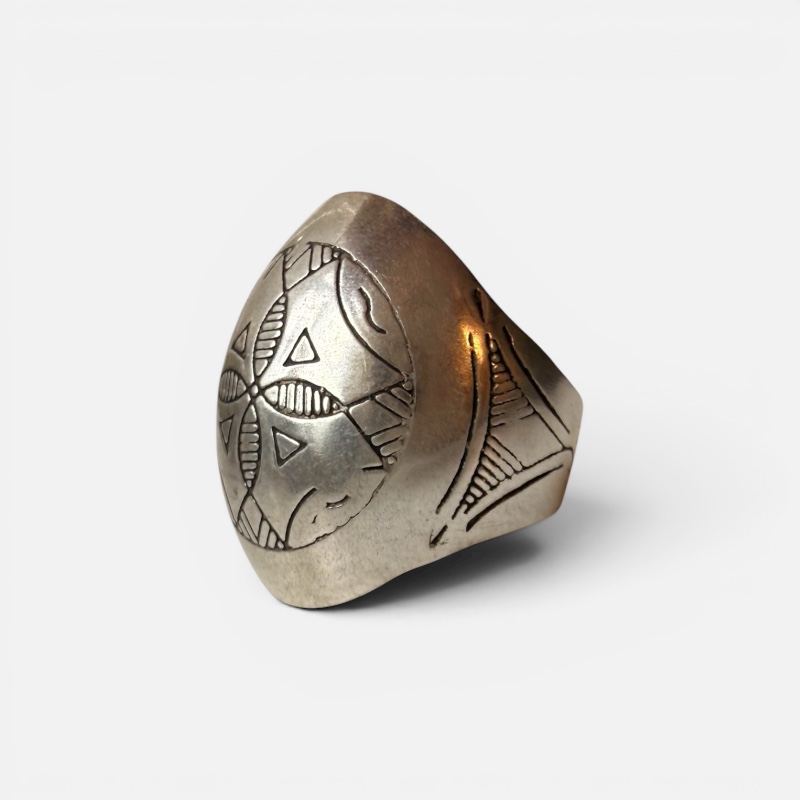 The surface is decorated with delicate geometric patterns that create a harmonious rhythm and give the ring an almost architectural touch. The engraved lines and shapes are reminiscent of traditional Berber symbols, with every detail executed with great precision.