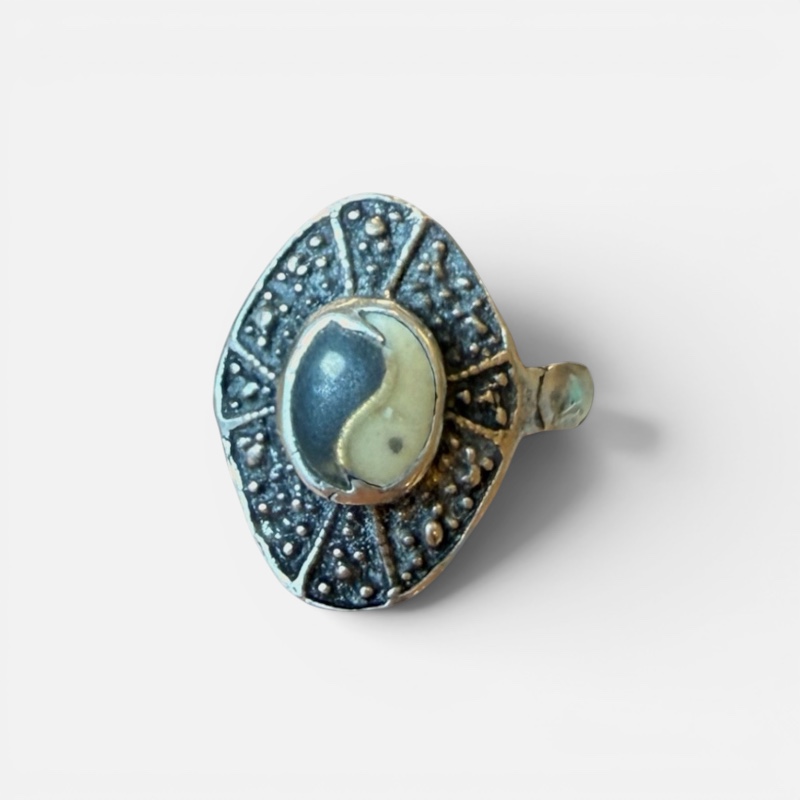 In the middle of the ring sits an oval stone with a beautiful yin-yang motif. The stone catches the eye with its soft shine and organic pattern.