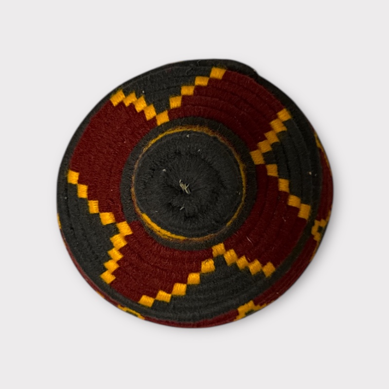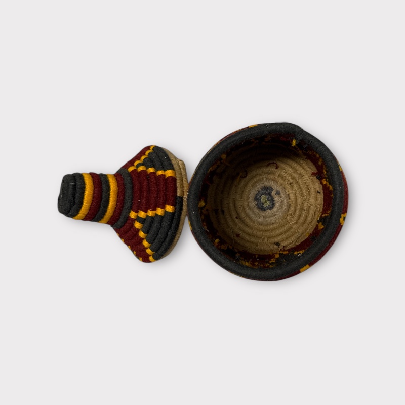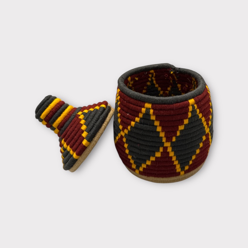 This beautiful Berber basket is handmade by women in Morocco's Atlas Mountains, where generations of experience and tradition come together in every braid. It is made of natural grass and wrapped with wool threads in dark gray, burgundy and golden shades, which together form a classic, timeless pattern.