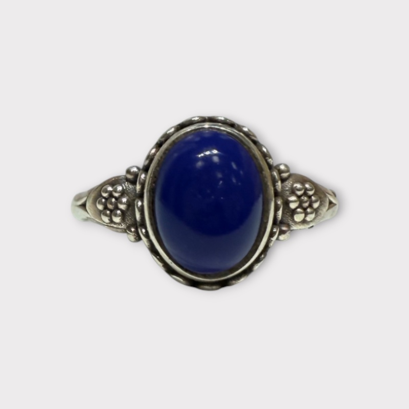 Handmade silver ring with a purple amethyst, cut in oval cabochon shape and set in a detailed silver design.