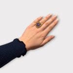 Berber Bloom est une bague berbère artisanale en argent, ornée d'un émail traditionnel aux nuances bleu foncé et dorées.