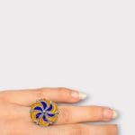La bague a la forme d'un soleil épanoui, chaque petit compartiment étant rempli d'émail coloré, ce qui lui confère une surface magnifique et brillante.