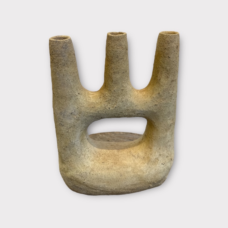 Bougeoir à trois bras façonné à la main, en argile brute non émaillée, chacun avec sa propre expression. Tamegroute Flow présente un design sculptural et organique rappelant les formes douces de la nature et les pierres usées par le vent du désert. Sa forme ouverte et sa surface rugueuse le rendent à la fois moderne et intemporel.