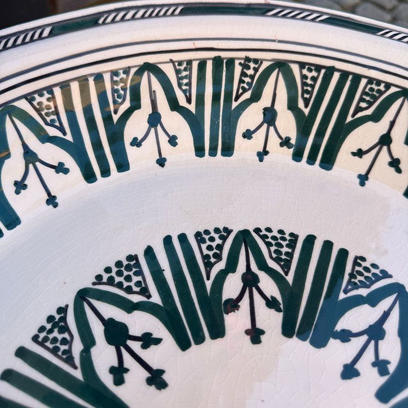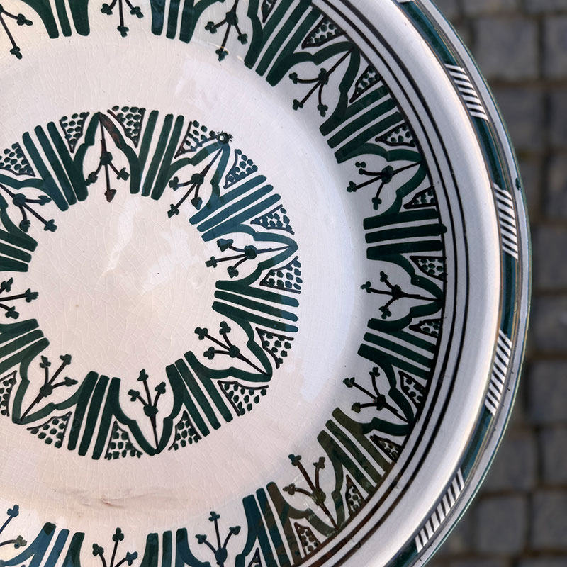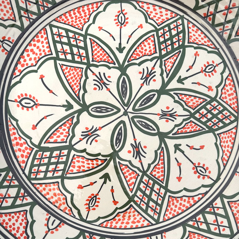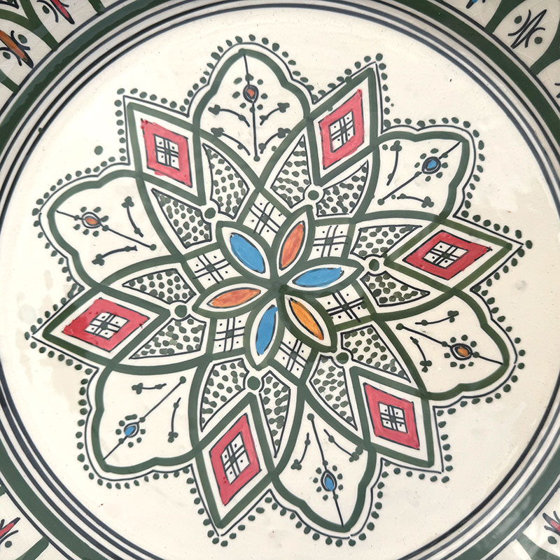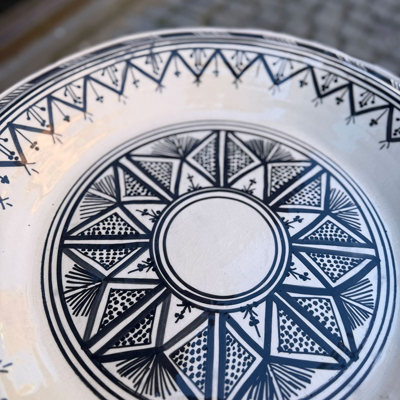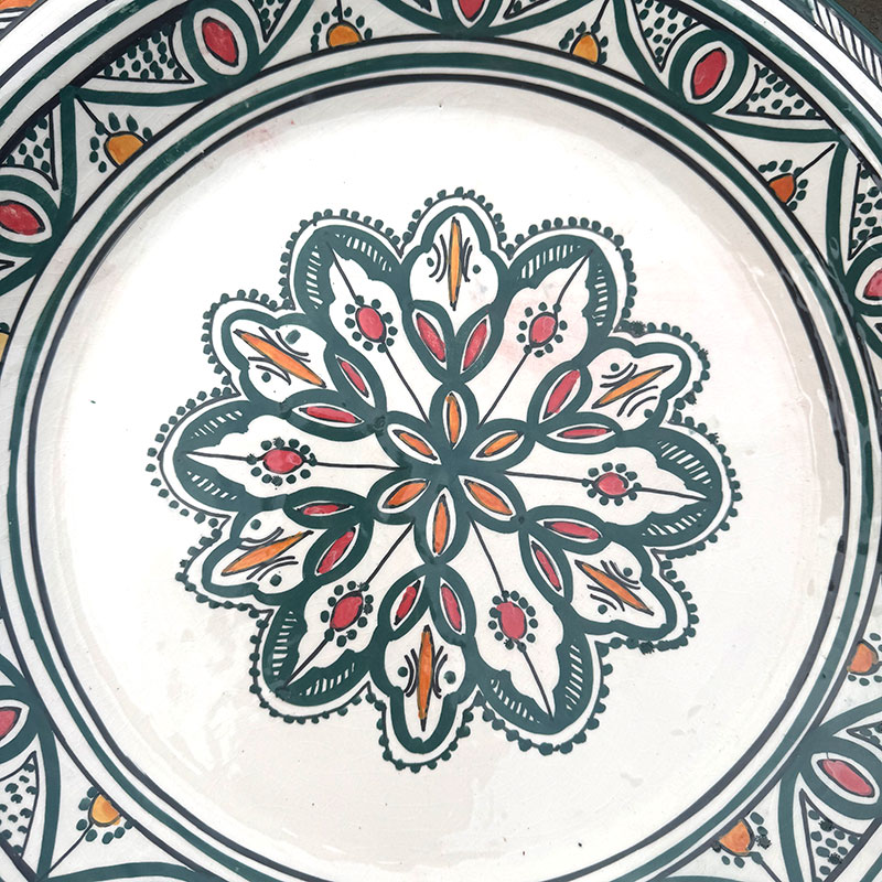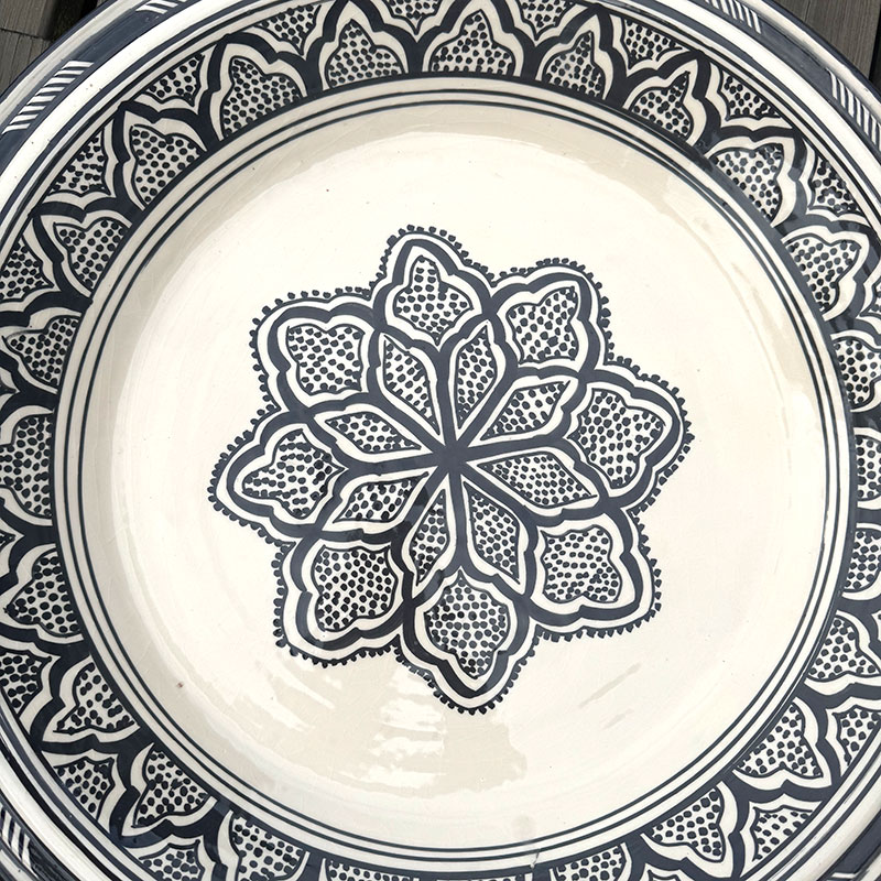 Magnifique couscous marocain au motif marocain unique. Le plat Il mesure 48 cm de diamètre et 6 cm de hauteur. Son bord arrondi et haut permet de servir des portions plus généreuses, qui restent à l'intérieur du plat et ne débordent pas.
