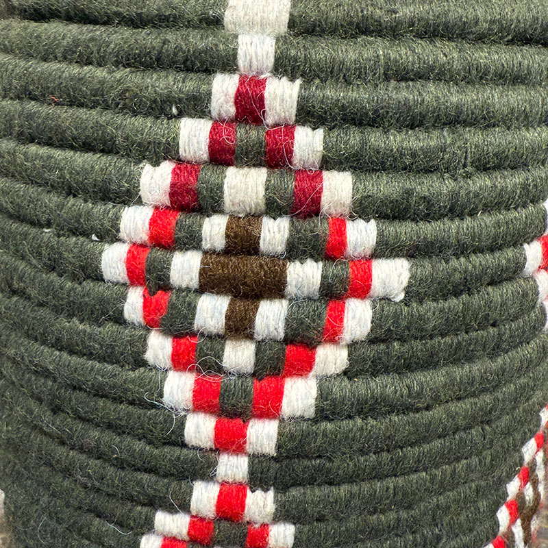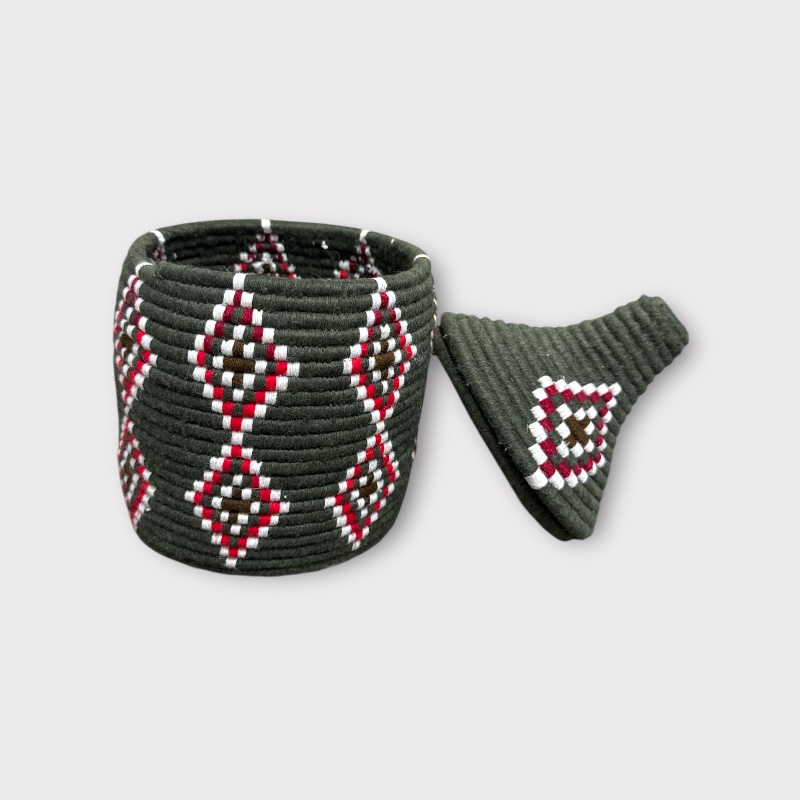 Fabriqué à la main par des femmes de l'Atlas marocain, ce panier est tressé en herbe naturelle, soigneusement enveloppé de fils de laine aux tons vert olive profond, rouge, marron et blanc. Ses motifs graphiques s'inspirent des symboles berbères, souvent synonymes de force, de protection et de lien avec la nature.