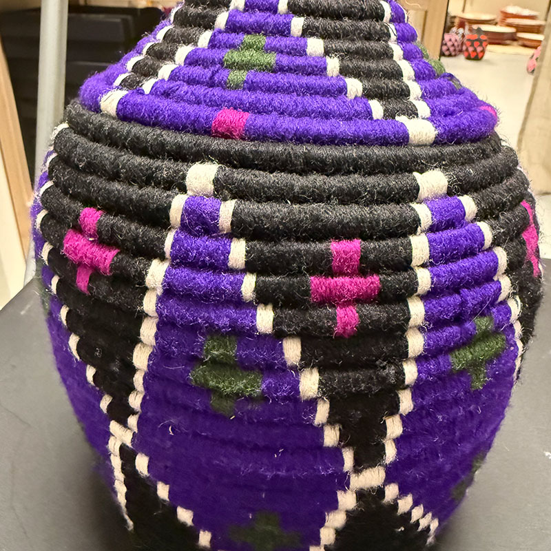 Ce panier berbère unique est fabriqué à la main par des femmes de l'Atlas marocain, où des générations de tradition et de créativité se mêlent dans chaque motif. Confectionné en herbe naturelle, il est enveloppé de fils de laine violets, noirs, verts, roses et ivoire, créant ainsi une expression harmonieuse et vibrante inspirée des motifs et symboles marocains.