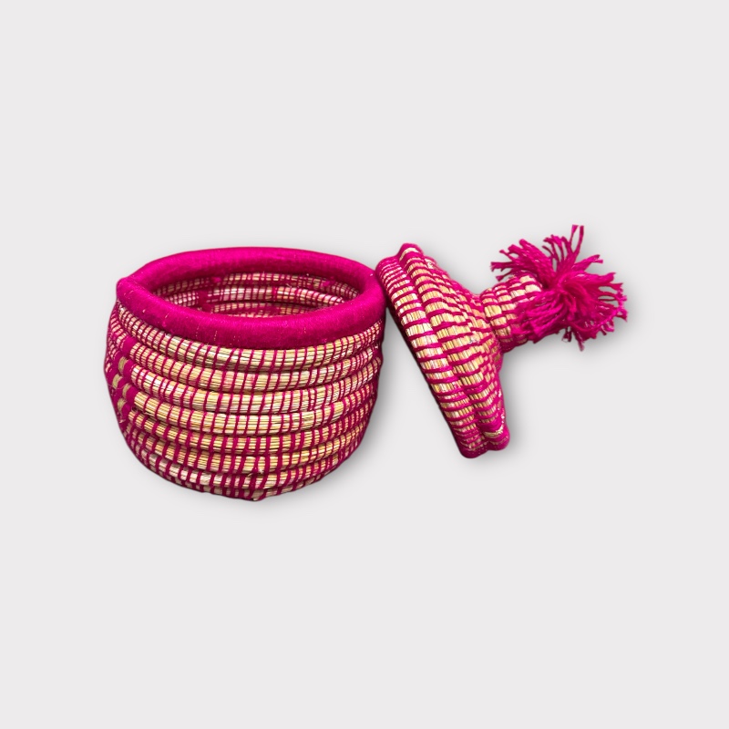 Panier marocain fait main en rotin naturel tressé de fils d'or. Disponible en trois coloris : rose, noir et bleu.