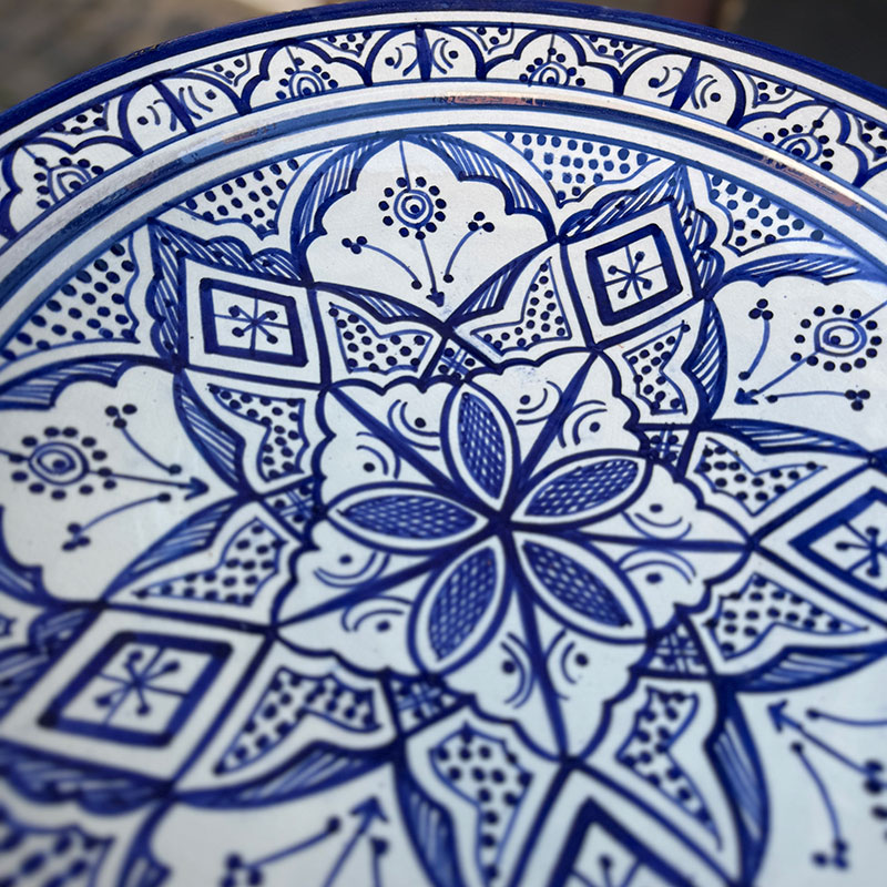 Magnifique plat marocain au motif marocain unique. Le plat Il mesure 42 cm de diamètre et 6 cm de hauteur. Son bord arrondi et haut permet de servir des portions plus généreuses, qui restent à l'intérieur du plat et ne débordent pas.