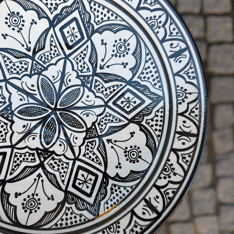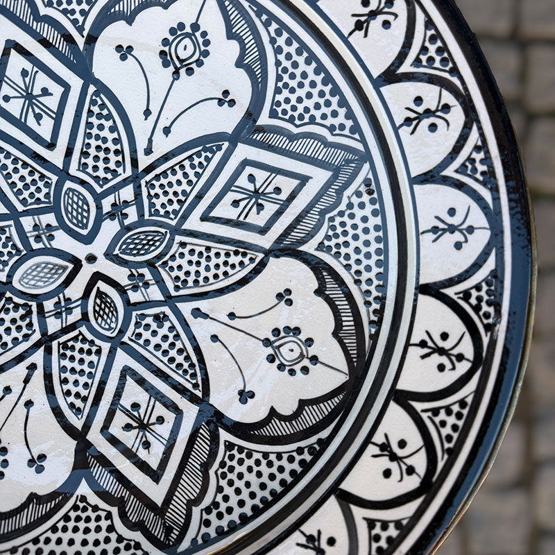 Magnifique plat marocain au motif marocain unique. Le plat Il mesure 42 cm de diamètre et 6 cm de hauteur. Son bord arrondi et haut permet de servir des portions plus généreuses, qui restent à l'intérieur du plat et ne débordent pas.