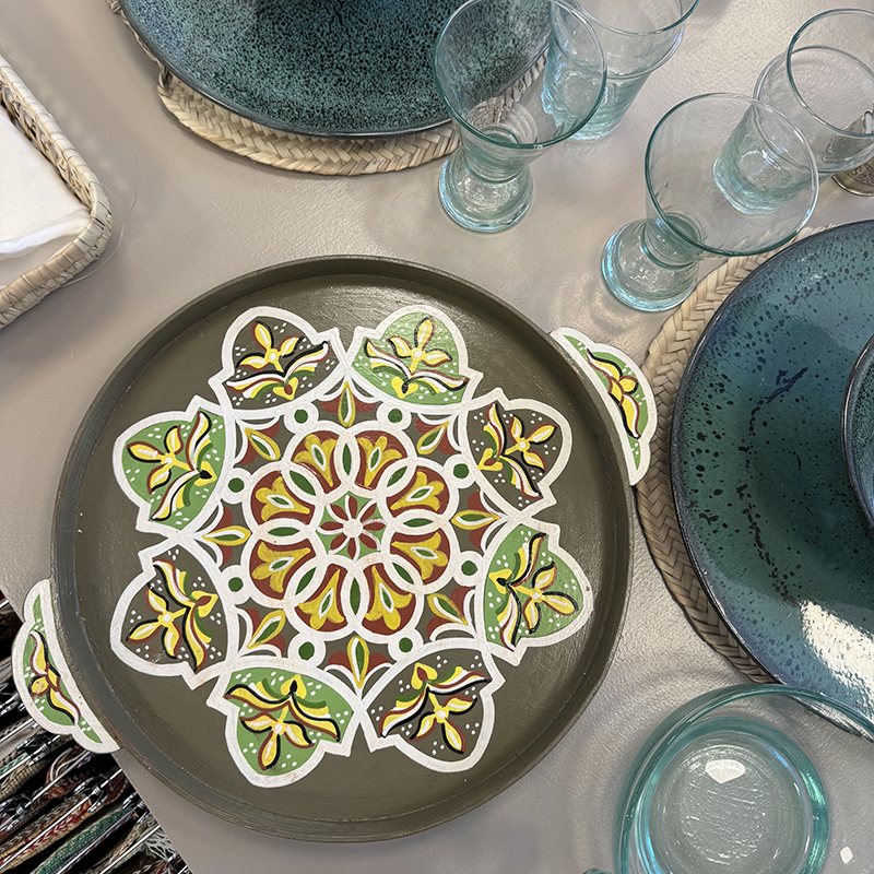 Chaque plateau est unique, non seulement parce qu’il est peint à la main, mais parce que l’artiste s’inspire souvent de sa propre imagination ou des traditions locales. Les plateaux sont ainsi bien plus que de simples objets pratiques : ce sont de petites histoires d’Afrique du Nord qui apportent chaleur, vie et histoire à la maison.