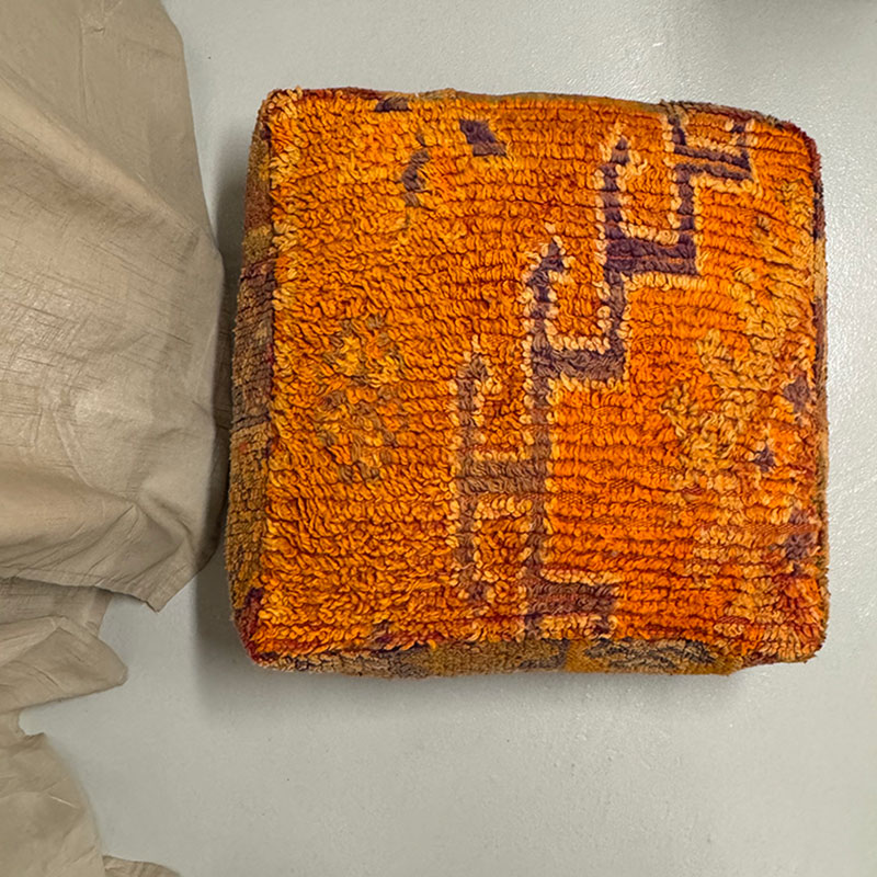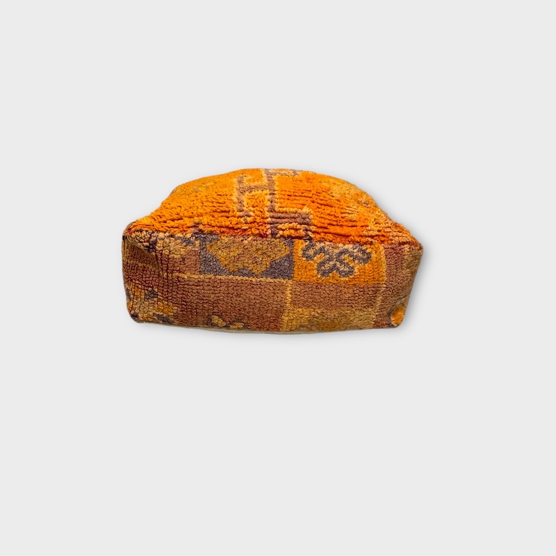 Ce superbe coussin de sol, fabriqué à la main au Maroc à partir d'un tapis berbère vintage, est empreint d'histoire, d'âme et de couleurs chaleureuses. Ses nuances intenses d'orange, de jaune doré et de brun lui confèrent une allure vivante et ensoleillée, tandis que ses motifs berbères traditionnels lui confèrent profondeur et authenticité.