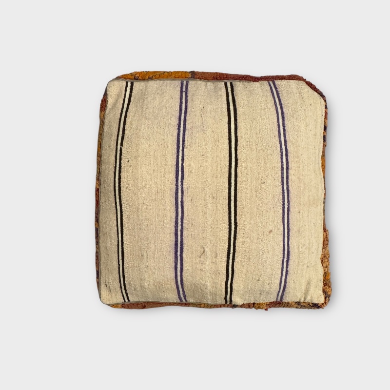 Dimensions : environ 60×60 cm et environ 25-30 cm de hauteur (peut varier légèrement car il est fait à la main) le dos est en tapis berbère rayé et il y a une fermeture éclair pratique pour faciliter le remplissage.