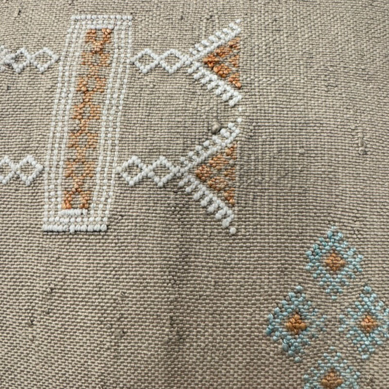 Housses de coussin marocaines uniques faites à la main en soie de cactus dans les tons de gris, beige et blanc.