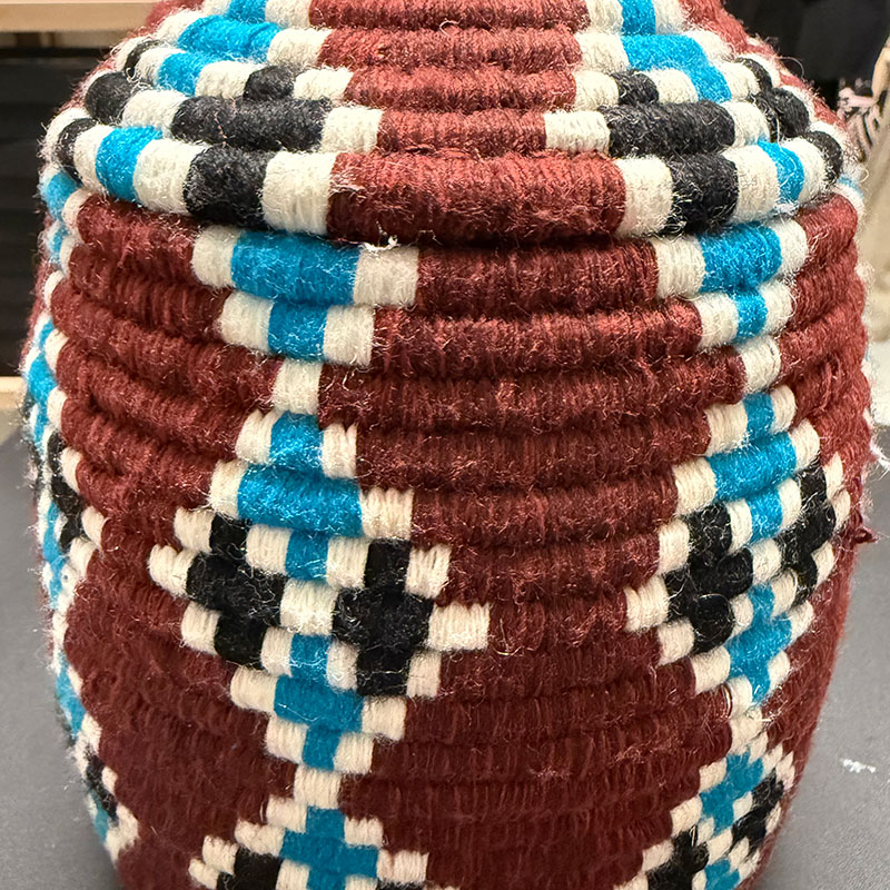 Kurven er håndlaget av kvinner i Marokkos Atlasfjell, vevd av naturlig gress, pakket inn i ulltråder i nyanser av rustrød, himmelblå, hvit og svart. Fargene er klassiske, men mønsteret er levende og fullt av energi – et symbol på marokkansk arv og rytmen i håndverket.