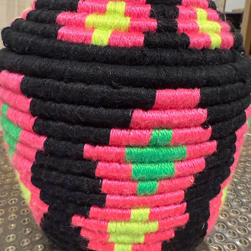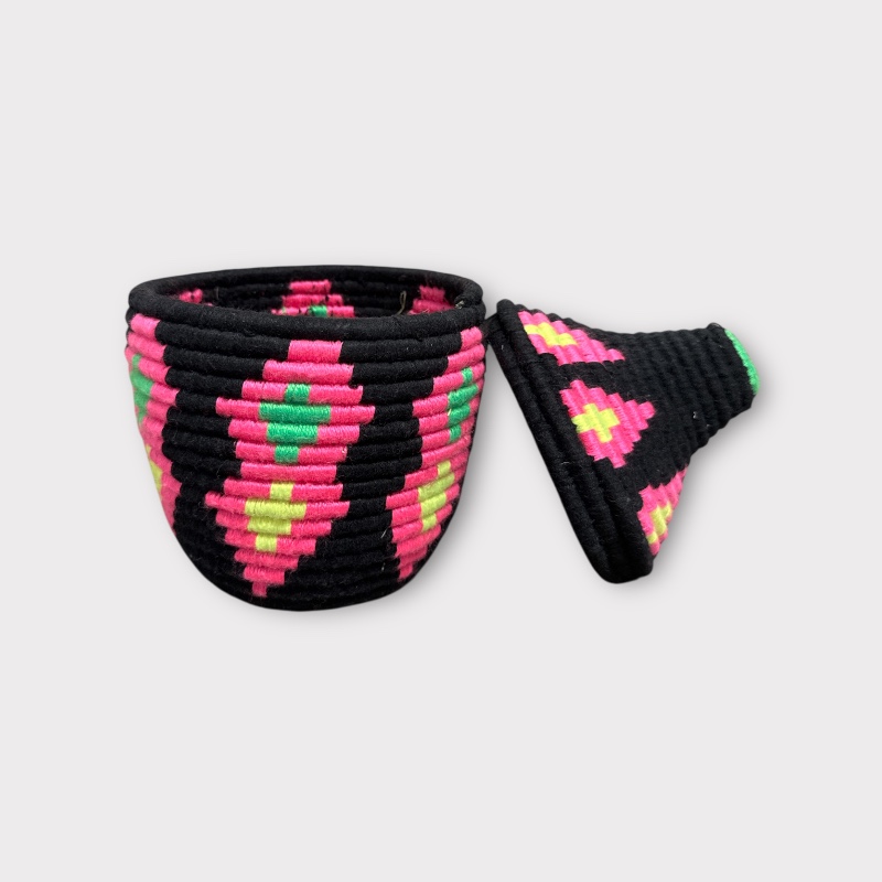 Denne håndlagde berberkurven er laget av kvinner i Marokkos Høye Atlasfjell, hvor tradisjon og håndverk går hånd i hånd. Kurven er laget av naturlig gress og pakket inn i fargerik ulltråd i svart, rosa, grønt og gult – et mønster som symboliserer energi, natur og kulturarv.
