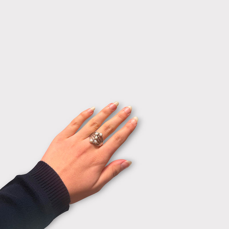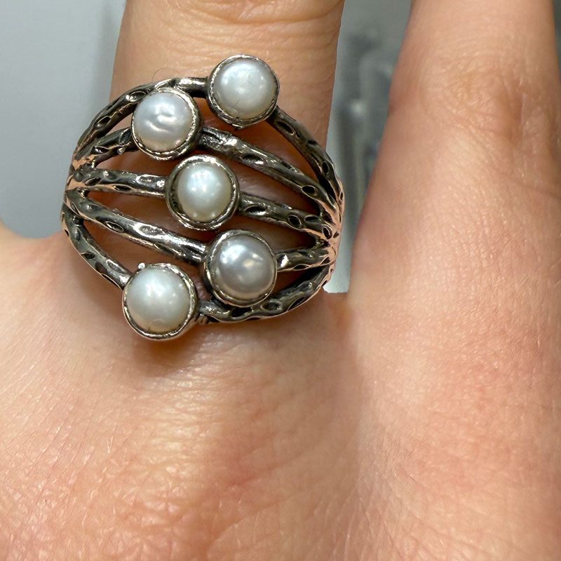 En håndlaget sølvring med fem små ferskvannsperler, satt i et organisk, grenlignende sølvdesign.