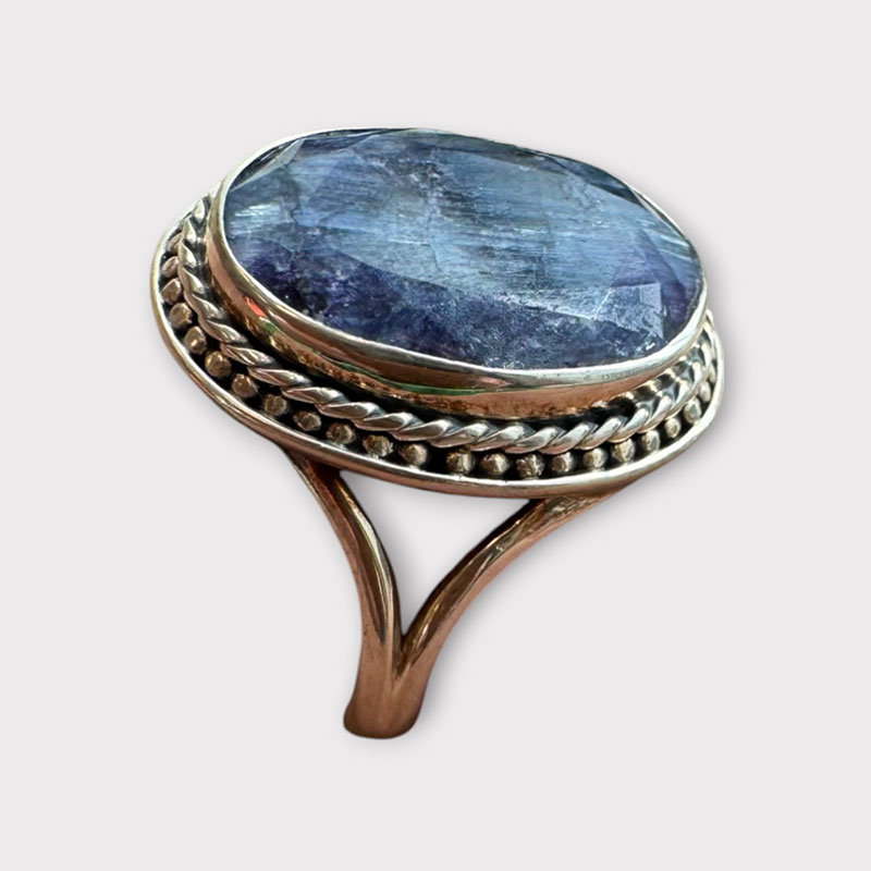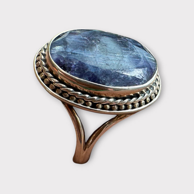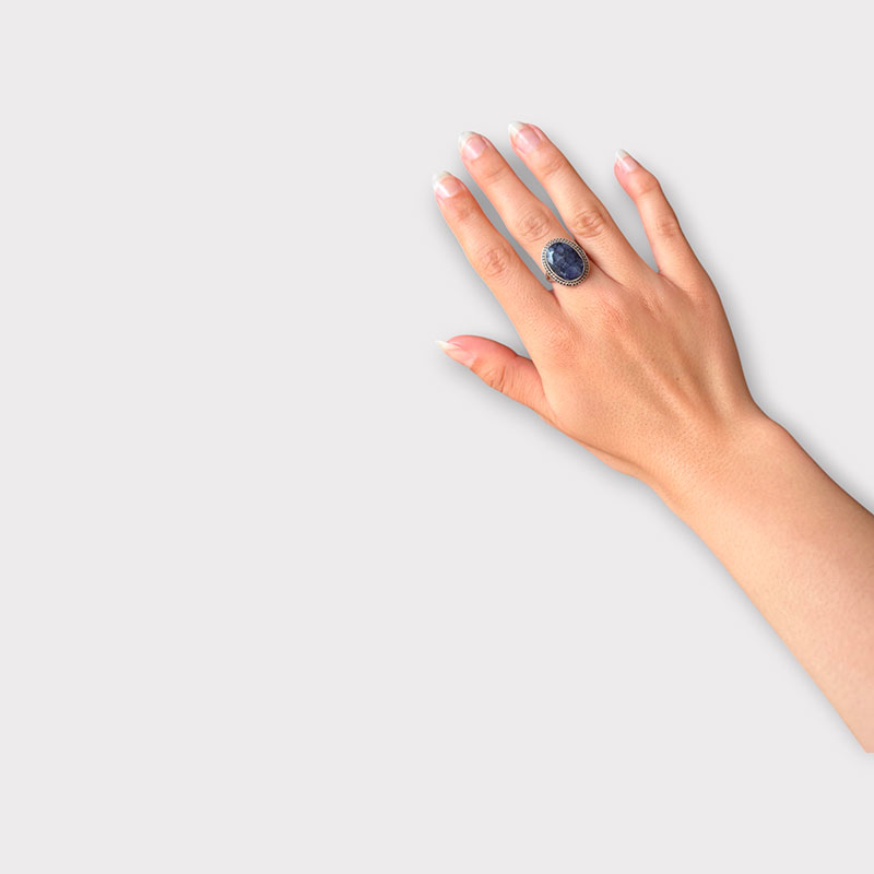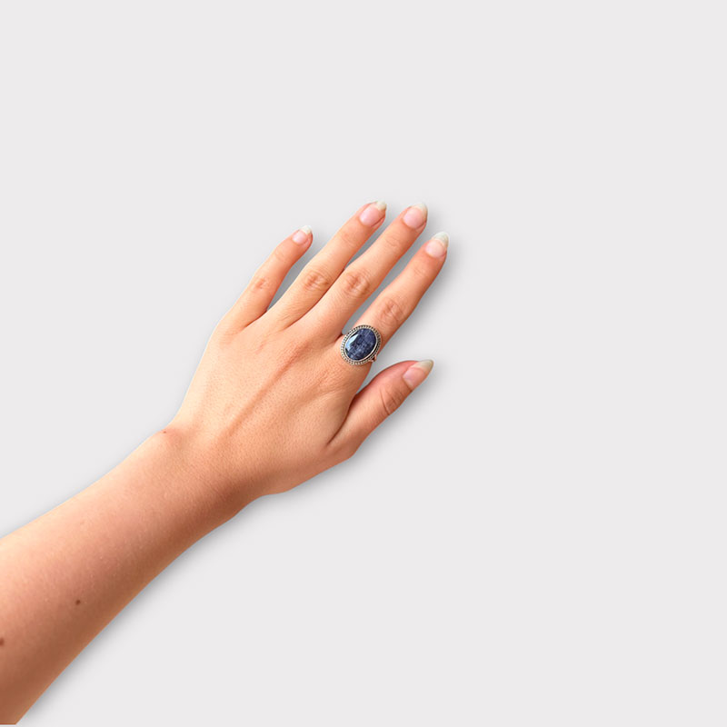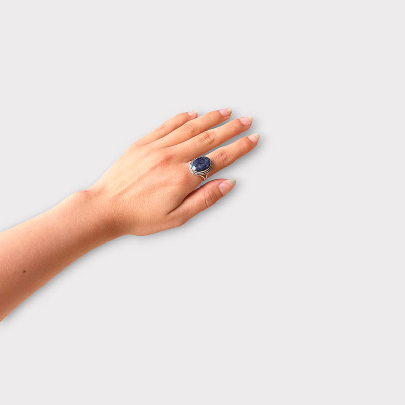 For å rengjøre sodalitt, bruk forsiktig en myk klut og om nødvendig en parfymert såpe. Skyll steinene og tørk dem grundig. Ikke la ringen lufttørke.