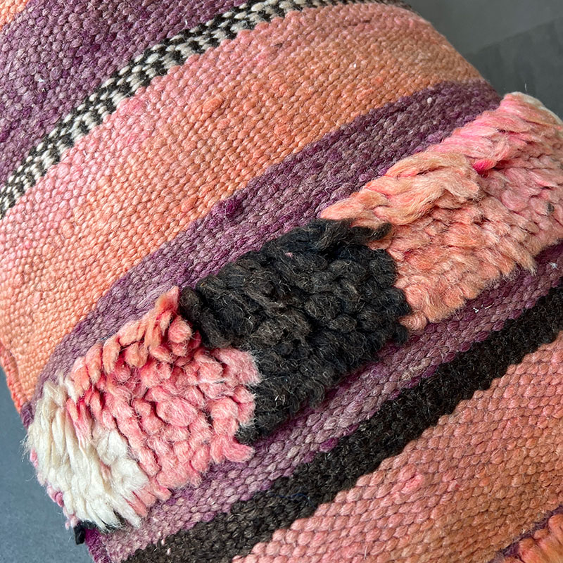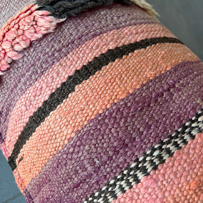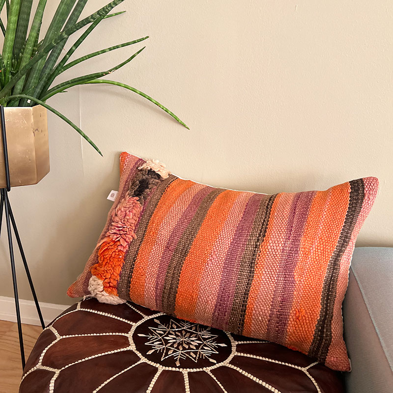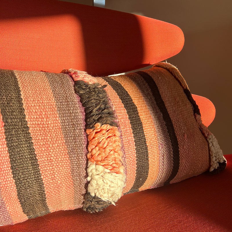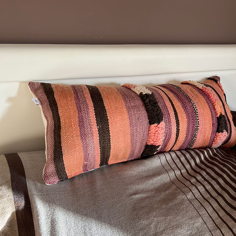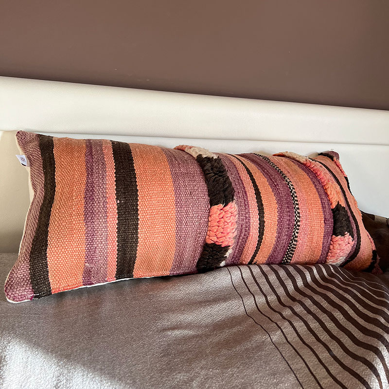 Deze prachtige handgemaakte kussenhoezen zijn gemaakt van vintage wollen vloerkleden. De voorkant van de kussensloop is van vintage Berbertapijt met een pluche rand, terwijl de achterkant van kiria-katoen is. Hier worden vintage tapijten uit Marokko nieuw leven ingeblazen in een kussenhoes die de warme tinten van het katoen combineert met de prachtige stoffen en patronen van de tapijten. De prachtige vintage tapijten brengen kleuren en spannende patronen in huis en afhankelijk van welk vintage tapijt we hebben gekozen, krijg je een geheel uniek kussen. De kussens passen perfect in het Scandinavische huis, waar de warme kleuren en patronen een eenvoudige en tijdloze stijl complementeren.