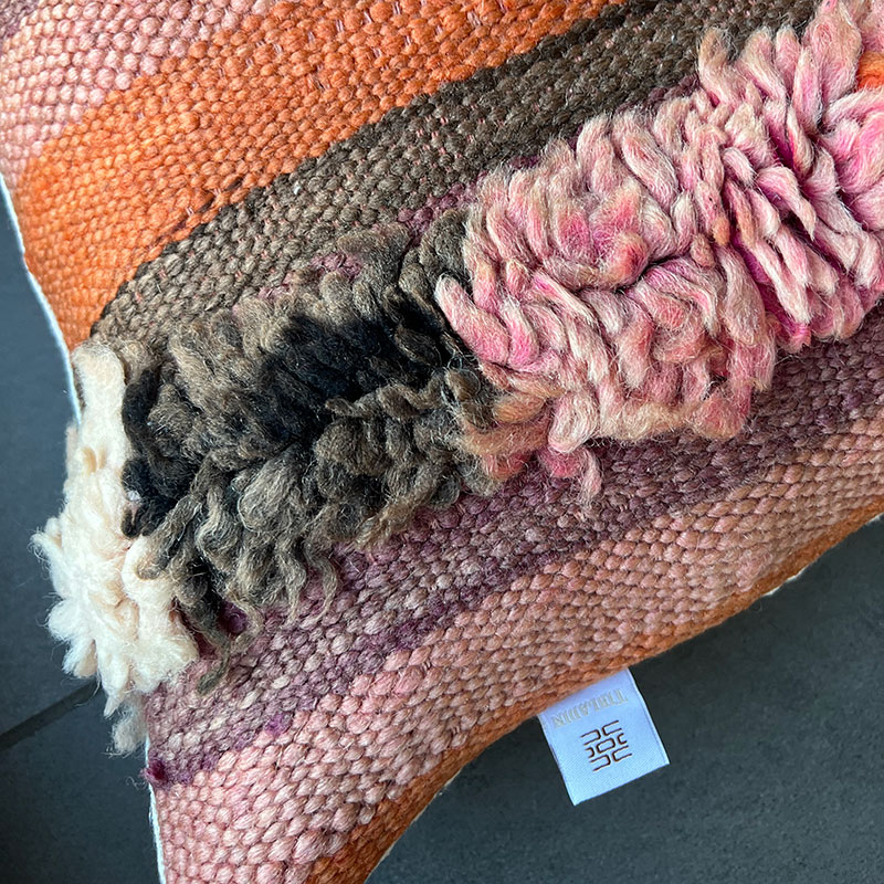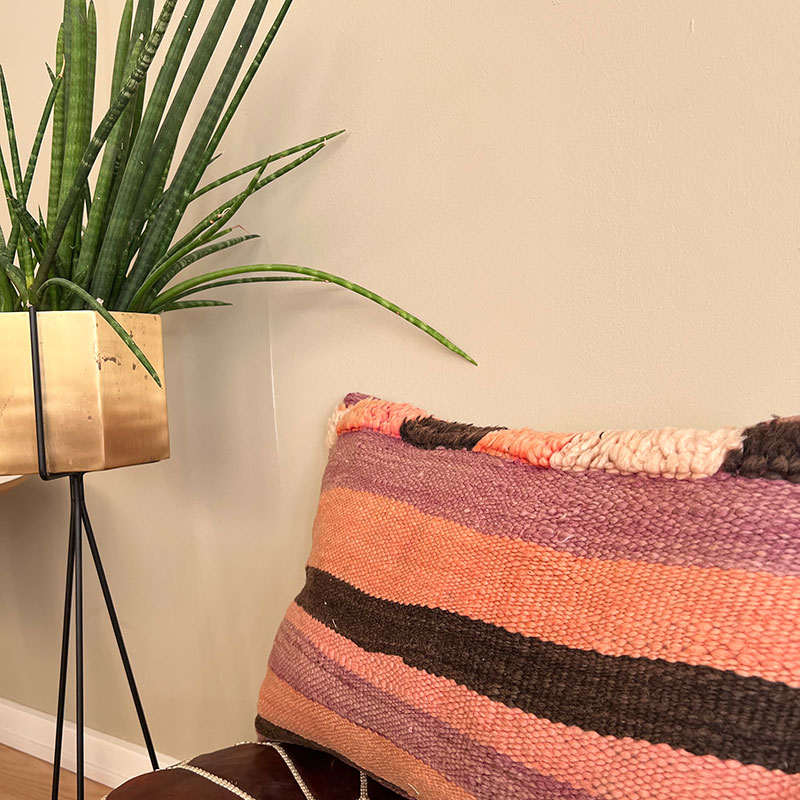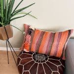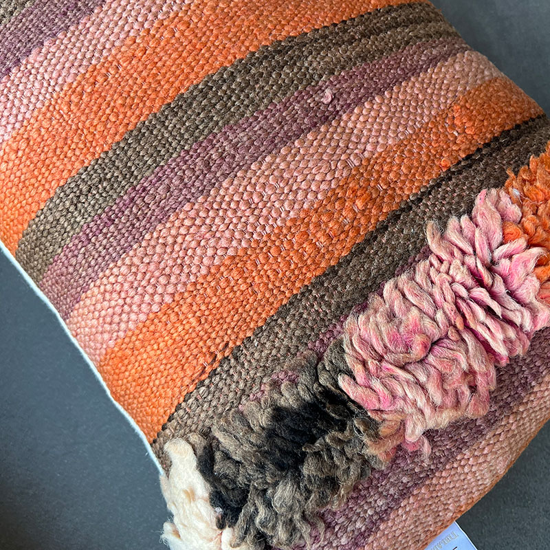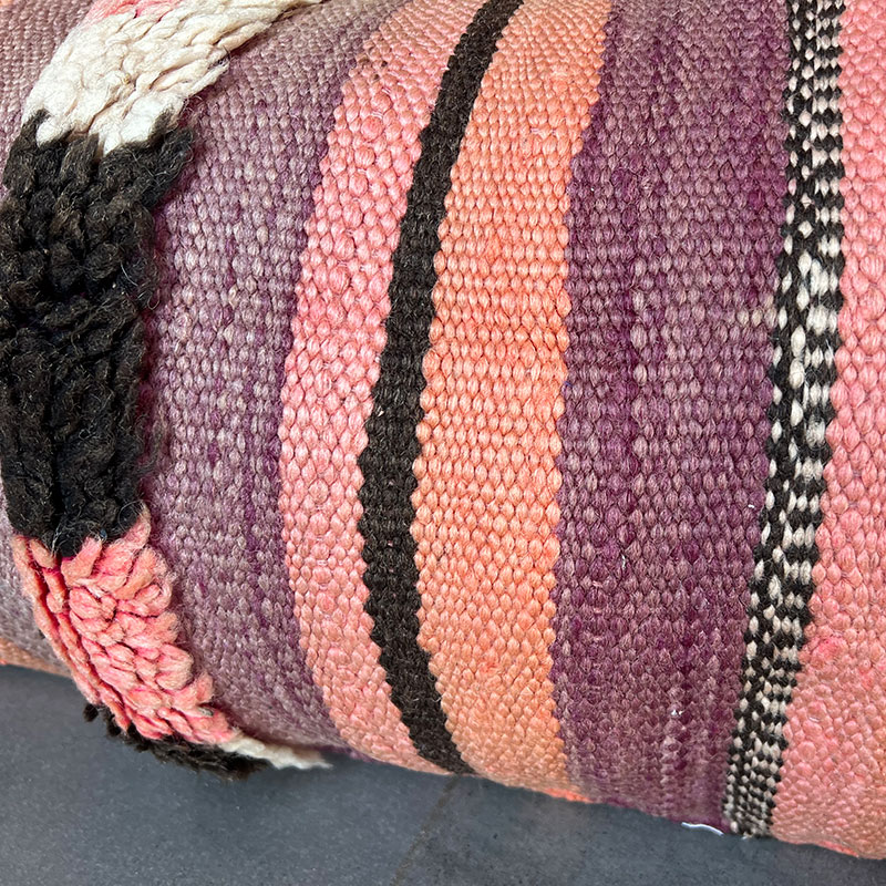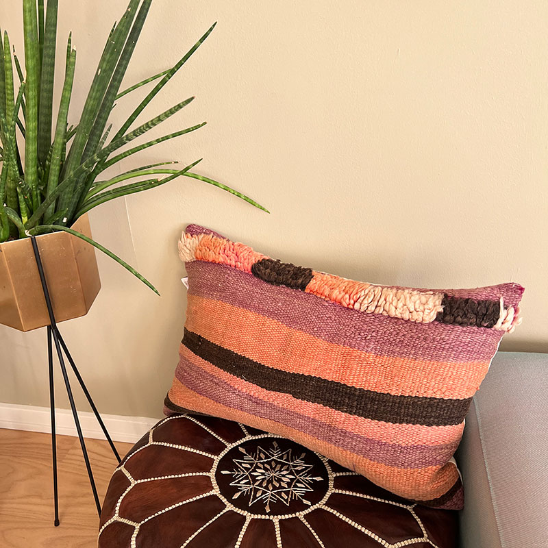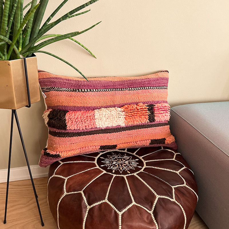 Deze prachtige handgemaakte kussenhoezen zijn gemaakt van vintage wollen vloerkleden. De voorkant van de kussensloop is van vintage Berbertapijt met een pluche rand, terwijl de achterkant van kiria-katoen is. Hier worden vintage tapijten uit Marokko nieuw leven ingeblazen in een kussenhoes die de warme tinten van het katoen combineert met de prachtige stoffen en patronen van de tapijten. De prachtige vintage tapijten brengen kleuren en spannende patronen in huis en afhankelijk van welk vintage tapijt we hebben gekozen, krijg je een geheel uniek kussen. De kussens passen perfect in het Scandinavische huis, waar de warme kleuren en patronen een eenvoudige en tijdloze stijl complementeren.