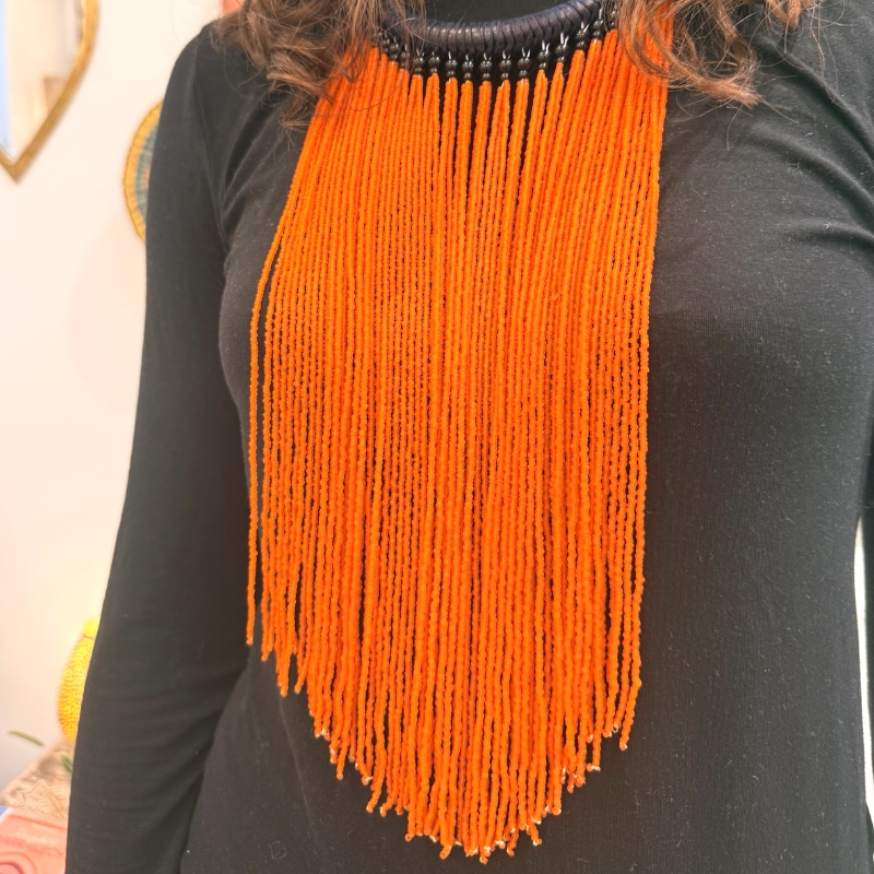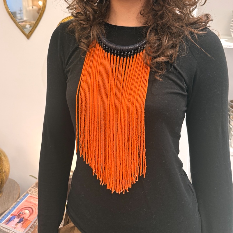 Deze ketting is een kleurrijk accent in je outfit dankzij de lange parelketting en de warme oranje kleur. Hij staat prachtig bij een eenvoudige jurk of een nauwsluitende blouse, waar de parels echt opvallen.