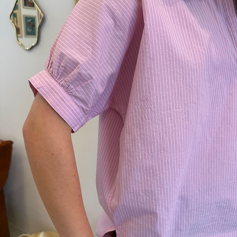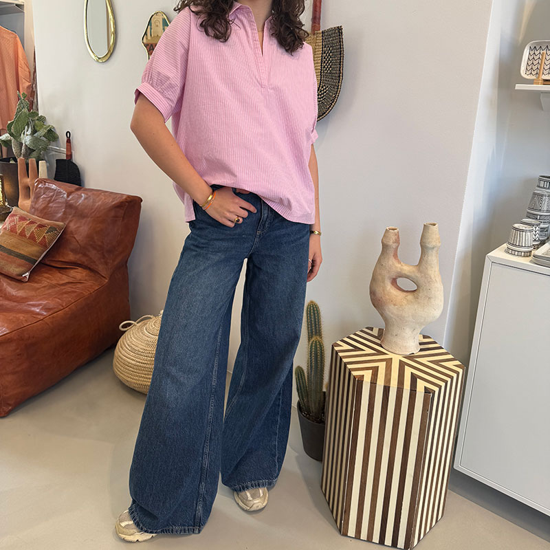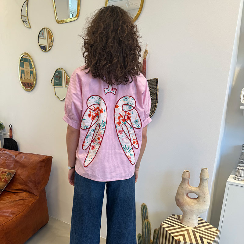 Gemaakt van licht, ademend katoen met fijne witte streepjes op een zachtroze basiskleur. Het heeft een relaxte, licht oversized snit met korte mouwen en een elegante, diepe halslijn. Aan de achterkant ontvouwt zich een set opgestikte gekleurde engelen vleugels, met bloemdetails die kracht en gratie in evenwicht brengen.