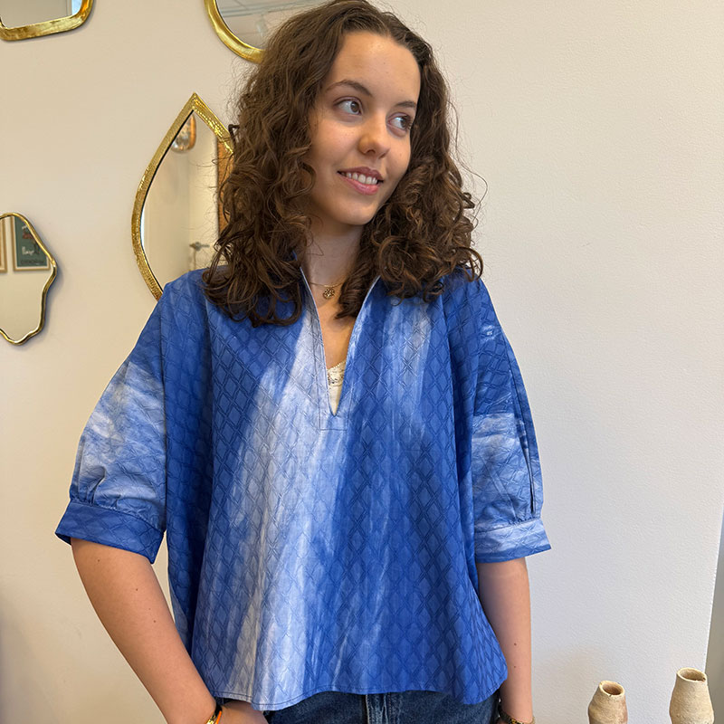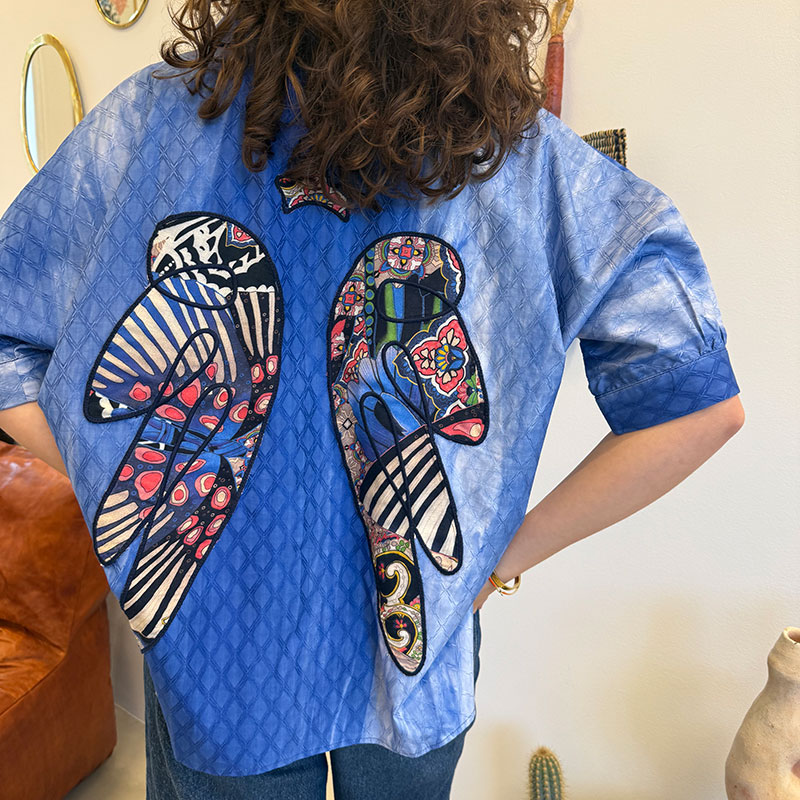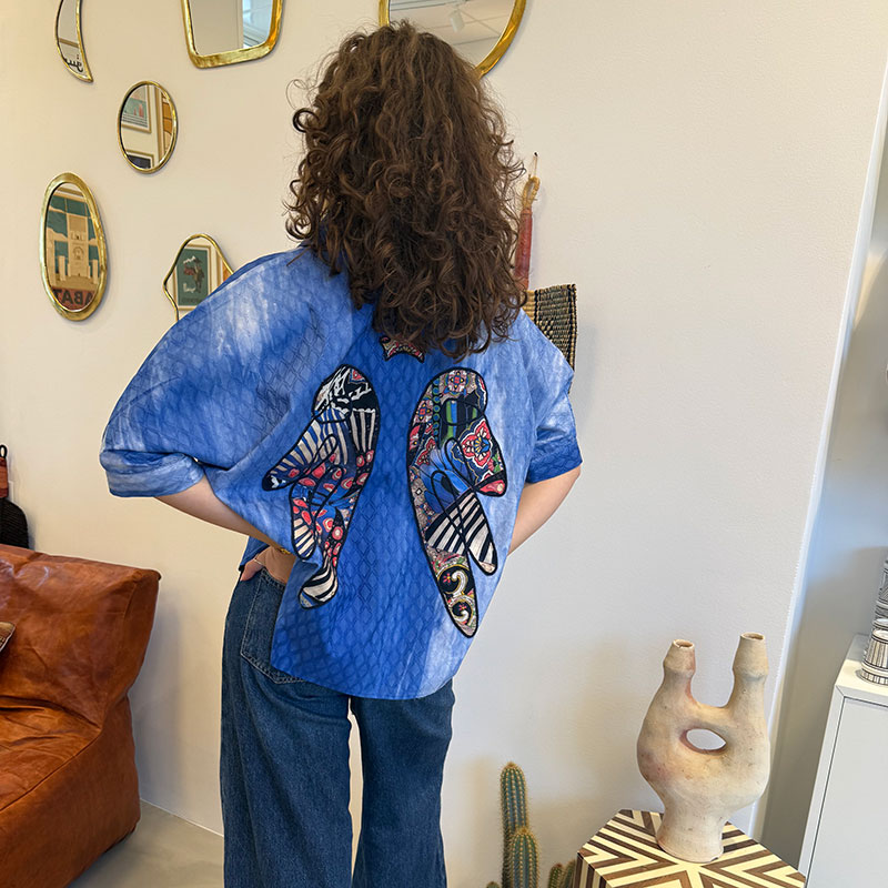 Gemaakt van licht, ademend katoen in een prachtige Majorelleblauwe kleur. Het heeft een koele, licht oversized snit met 3/4-mouwen en een elegante, diepe halslijn. Aan de achterkant ontvouwt zich een set opgenaaide, gekleurde engelenvleugels. De vleugels zijn samengesteld uit stof met patronen met arabesken, bloemen, strepen en grafische vormen in tinten rood, blauw, zwart en ivoor, allemaal omlijst met donkere, contrasterende stiksels.