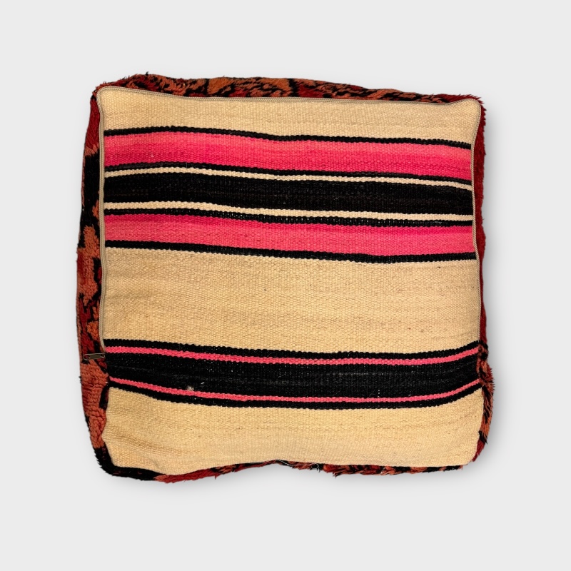 Afmetingen: ca. 60×60 cm en ca. 25-30 cm hoog (kan enigszins variëren omdat het handgemaakt is). De achterkant is van gestreept roze Berber tapijt en heeft een praktische rits om het vullen te vergemakkelijken.