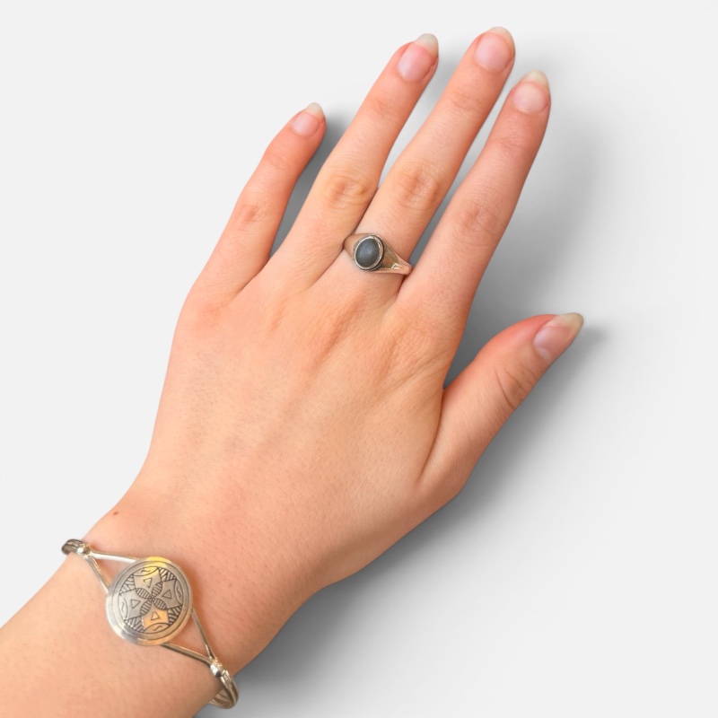 I midten sidder en sort sten, der skaber en smuk kontrast til det lyse sølv. Stenens dybe farve tilfører ringen et elegant og tidløst præg, mens den enkle indfatning holder udtrykket rent og stilfuldt.