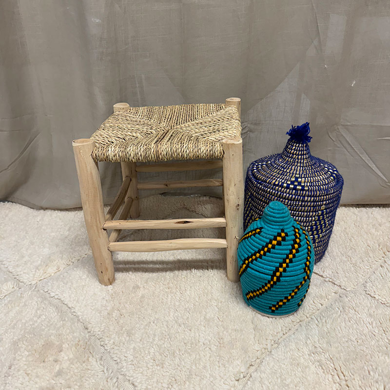 Skamlerne er håndlavet af kvinder i et kvindekooperativ syd for Marrakech. Kooperativet beskæftiger omkring 160 kvinder og spiller en vigtig rolle i at forbedre levevilkårene for mange familier i den lille landsby. Når du vælger denne skammel, får du ikke blot et smukt og funktionelt møbel – du støtter også traditionelt håndværk, bæredygtig produktion og kvinders mulighed for økonomisk selvstændighed.