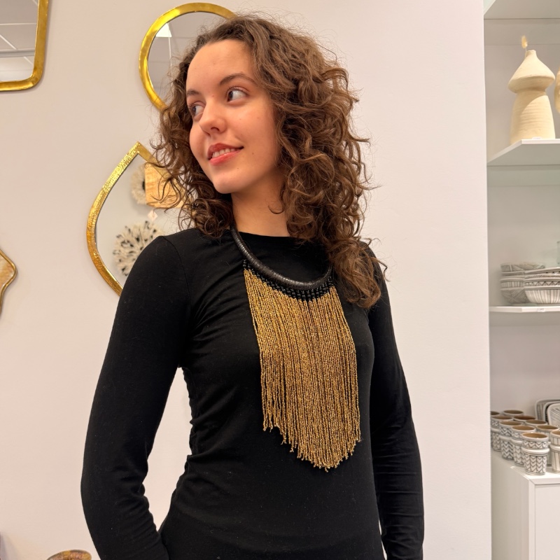 Unikt pärlhalsband handgjort i Marocko av en afrikansk designer. Halsbandet kombinerar traditionellt hantverk med ett modernt och iögonfallande uttryck.