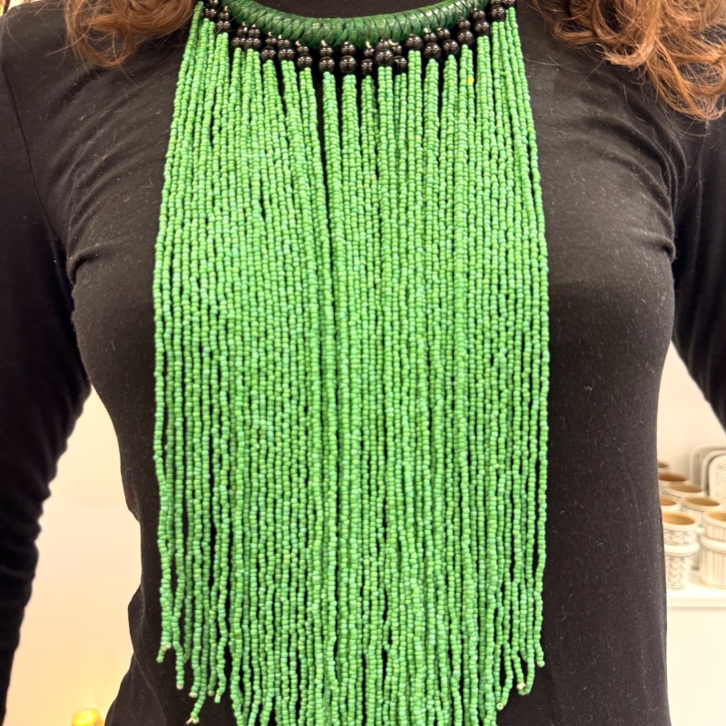 Halsbandet är flätat av läder i en mörkgrön färg som matchar de gröna pärlorna. De långa, fina pärltrådarna faller vackert över bröstet och skapar ett distinkt, men ändå lätt och rörligt utseende. Den texturerade ytan ger smycket ett exklusivt och handgjort utseende.