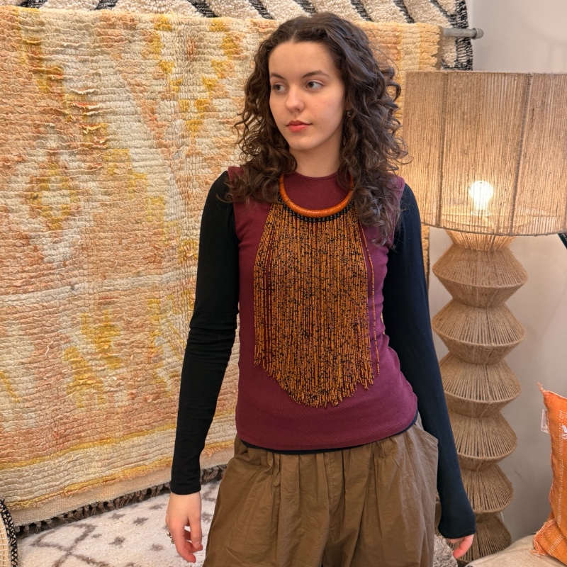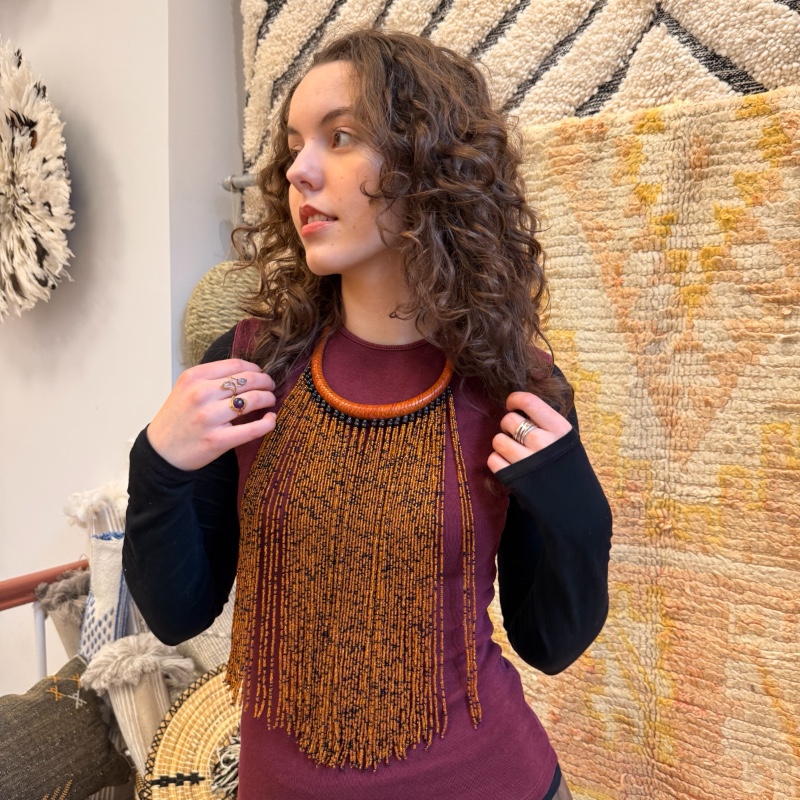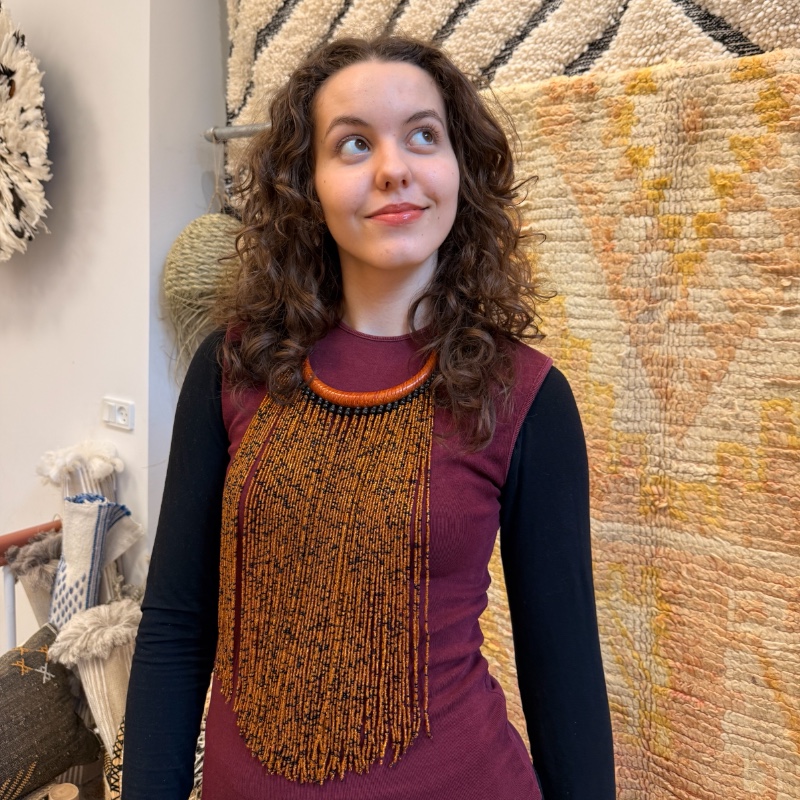 Unikt pärlhalsband handgjort i Marocko av en afrikansk designer. Halsbandet kombinerar traditionellt hantverk med ett modernt och iögonfallande uttryck.