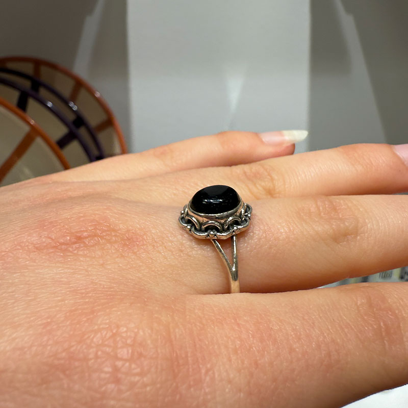 En handgjord silverring med en svart onyx, vackert inramad i en blommigt silvermönster, vilket ger ett feminint och tidlöst uttryck.