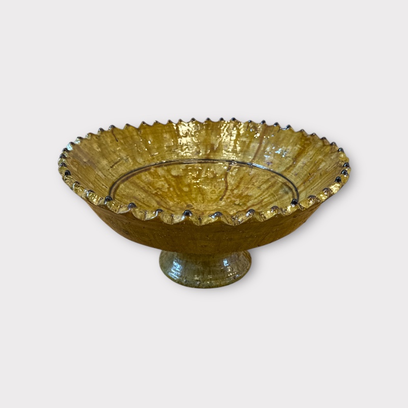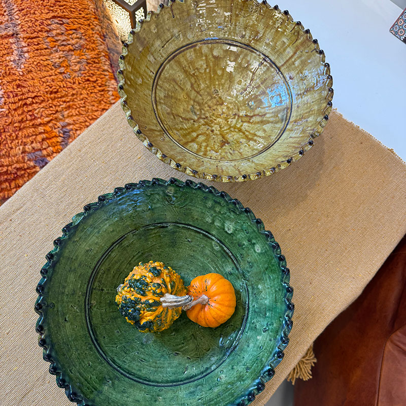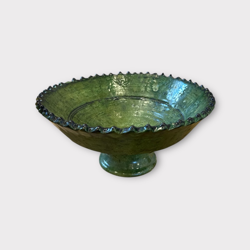 Vacker skål i Tamegroute-keramik med dekorativ tandad kant. Glasyren framträder i livfulla nyanser som varierar från skål till skål, vilket ger varje skål sitt eget uttryck. Varje skål är handgjord i Marocko och helt unik. Den mäter ca 30–32 cm i diameter och 13 cm i höjd och står vackert på sin lilla fot – perfekt som ett dekorativt element i hemmet.