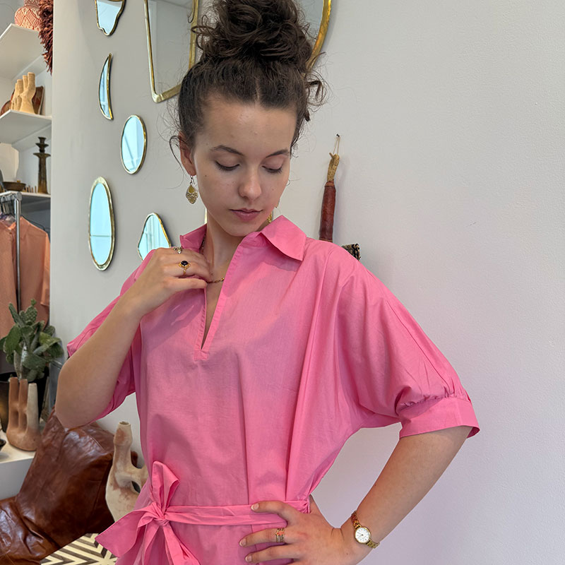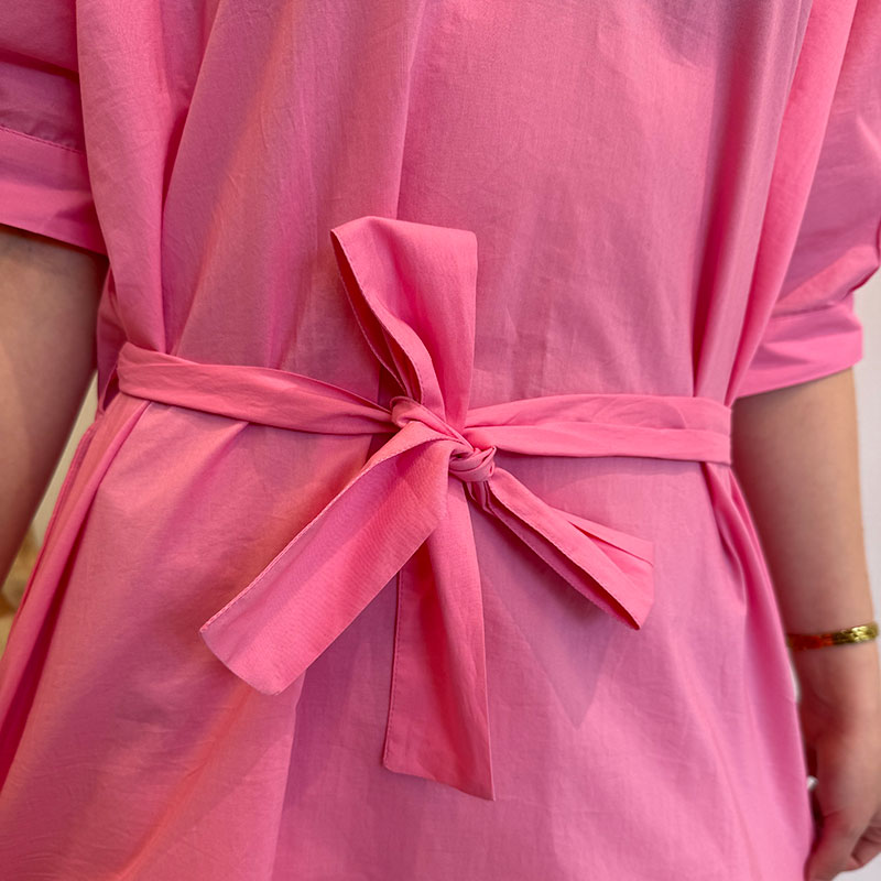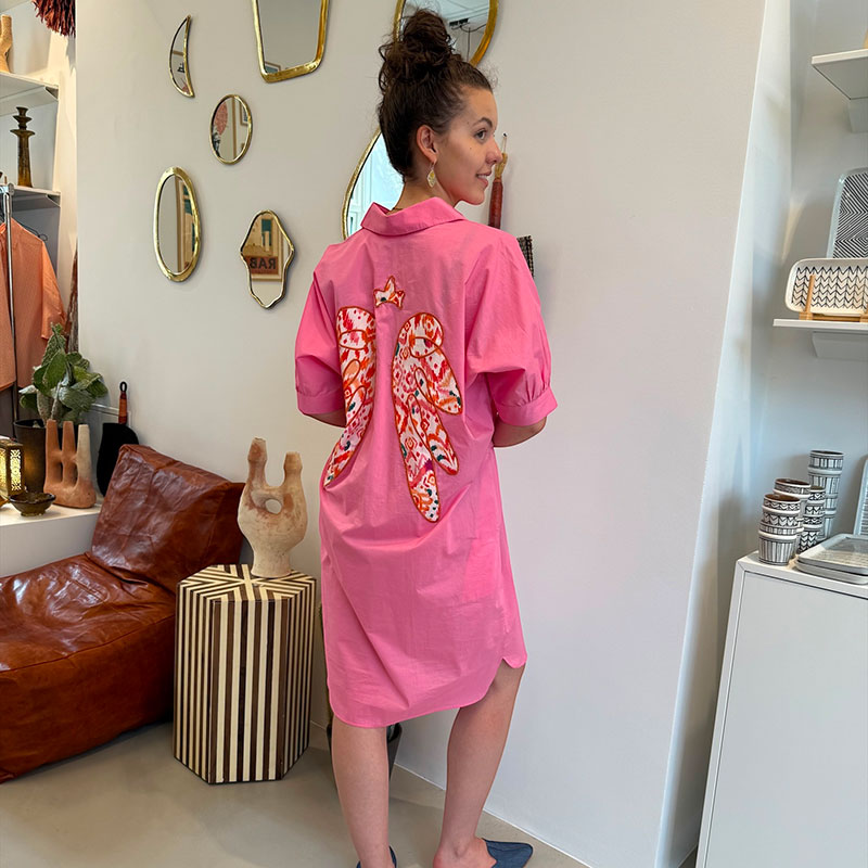 Denna lätta bomullstunika är både lekfull och elegant. Den har en avslappnad passform med korta ärmar, V-ringning och ett knytband i midjan, vilket gör att du kan framhäva din figur. Dessutom har tunikan fina rymliga fickor. Färgen är en fräsch, ljusrosa, som utstrålar sommar och glädje. Det som verkligen gör tunikan speciell är detaljerna på ryggen: ett par broderade vingar i ett färgglatt ikatmönster och en liten stjärna ovanför - ett fantasifullt och konstnärligt element som ger tunikan personlighet och edge.